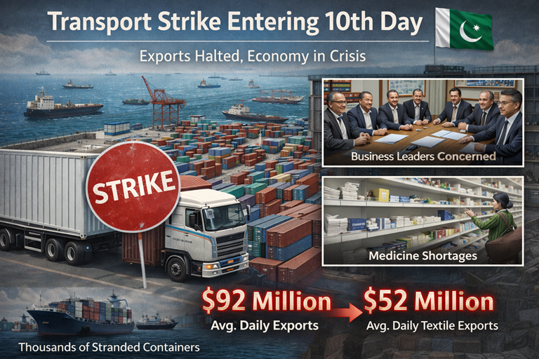 Pakistan’s nationwide goods transport strike has entered its 10th day, with industrialists warning that each passing day is costing the economy billions of rupees in lost trade and exports.